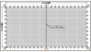 You may also need to install additional cross wires to prevent the net from sagging in the middle e.g. 20m x 10m nets.