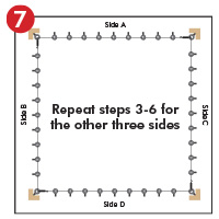 | Repeat steps 3-6 for the other 3 sides. | To install the net, attach one corner of the net to the corner fixing using a corner tie. | Hog-ring each square to the wire rope, ensure the net is pulled tight and square. Attach the other 3 corners using net corner ties. Trim off any excess net. |