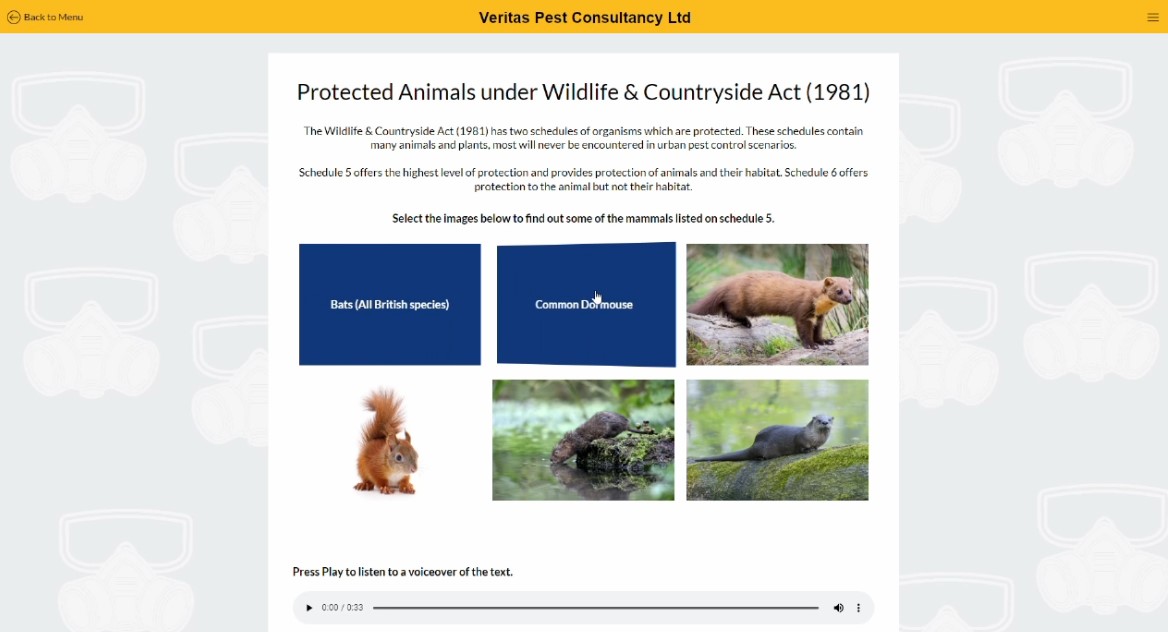 Progress through the range of modules available to complete the course. Supported with audio voice overs.