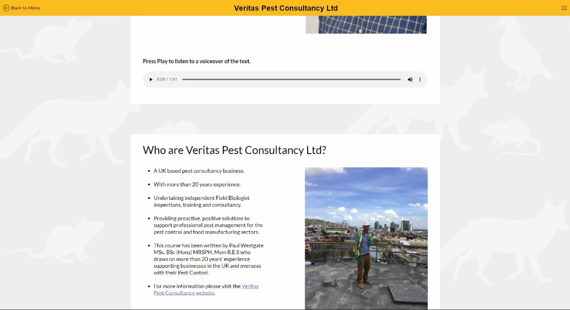 Our set of E-Learning courses are a useful learning tool for those studying towards the RSPH Level 2 Award in Pest Management qualification. These courses also serve as a useful revision tool for those who are already active in pest management.